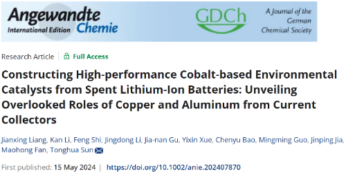 环院智慧 | 贾金平团队Angew. Chem. Int. Ed.发文揭示废旧锂电池中集流体元素对资源化环境催化剂的影响机制