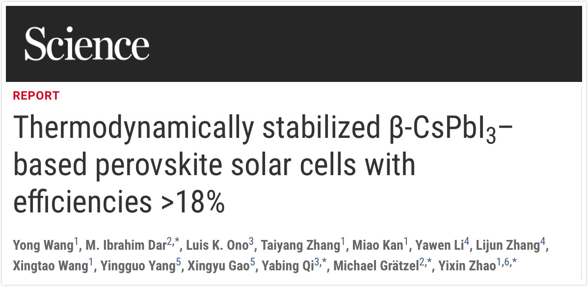 《科学》发表BETVICTOR赵一新团队的无机钙钛矿太阳能电池最新研究成果