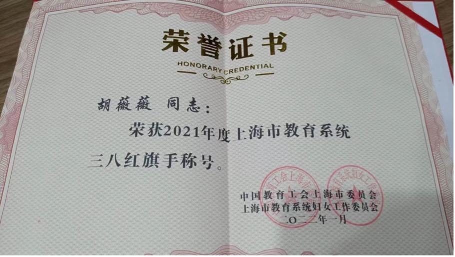 2022年,支部党员胡薇薇荣获2021年度上海市教育系统三八红旗手称号