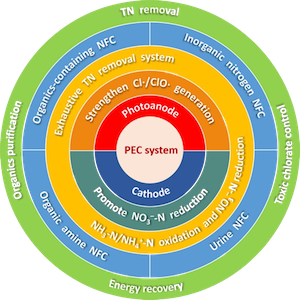 光催化燃料电池(PFCs)具有氧化有机污染物能力强、电子传递快、环境适应性强等优点,在难降解有机物降解和产能领域表现出巨大的潜力。周保学教授团队在PFCs研究的基础上,将上述耗竭脱氮机制引入PFCs中,提出了含氮废水燃料电池(NFCs)的新概念。在NFCs体系中,含氮物质被完全转化为氮气,含氮物质和有机物降解释放的化学能得到回收(Applied Catalysis B: Environmental, 2018, 238,168-176; Water Research, 2019, 152, 117-125; Environmental Science & Technology, 2022, 56, 2562-2571)。NFCs体系被应用于处理多种复杂的含氮废水,如无机氮(氨氮/硝态氮)、尿液、有机胺、含氮有机废水等的处理和产能。在此基础上还将研究进一步拓展至尿液脱氮产氢领域(Environmental Science & Technology, 2022, 56, 9693–9701; Environmental Science & Technology, 2023, 57, 2939–2948; Applied Catalysis B: Environmental, 2023, 324, 122229)。