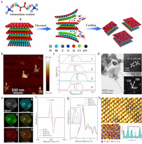 图1 制备和表征均相N掺杂和共生表面OV的BiOCl原子层