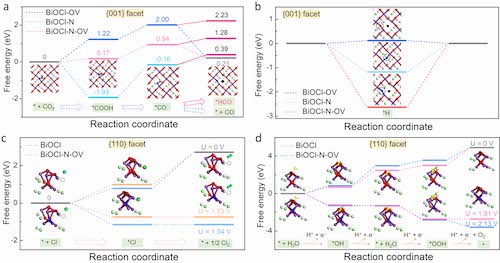 DFT模拟结果表明,在BiOCl-N-OV原子层(001)晶面,N-OV缔合结构能够显著降低CO2活化产生*COOH能垒,并促进*CO直接脱附为CO而非碳氢化合物中间体(*HCO);与此同时,N-OV缔合结构还能够显著增强*H吸附能,抑制HER过程。在BiOCl-N-OV原子层(110)晶面,溶液中Cl-会通过类Mars-van Krevelen机制在BiOCl晶格氯处活化产生HClO;掺杂的N原子会增加OER过程中间产物*OH的脱氢能垒,并显著增大OER平衡电势,从而抑制BiOCl-N-OV原子层表面OER过程,促进ClER反应顺利进行。