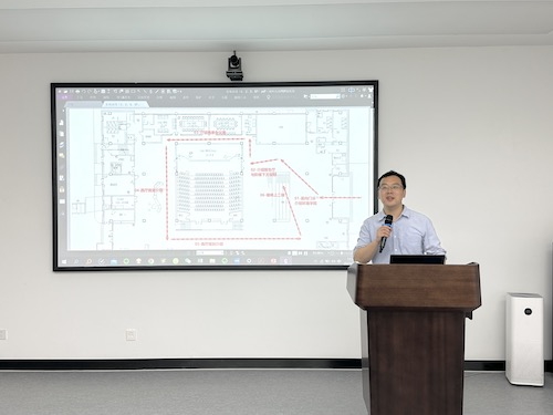 徐臻从公司新大楼建设概况、搬迁规划以及参观流线等方面展开具体汇报。他详细讲解了大楼各区域使用功能,重点介绍了建设过程中体现的环保亮点和人性化设计。他指出,新大楼从规划到设计都遵循绿色低碳理念,能为广大师生提供一流的学习、工作、科研环境,兼具健康、舒适、节能及环保特性,力争成为校园西区首例绿色星级建筑、国内优秀绿色校园建筑经典之一。