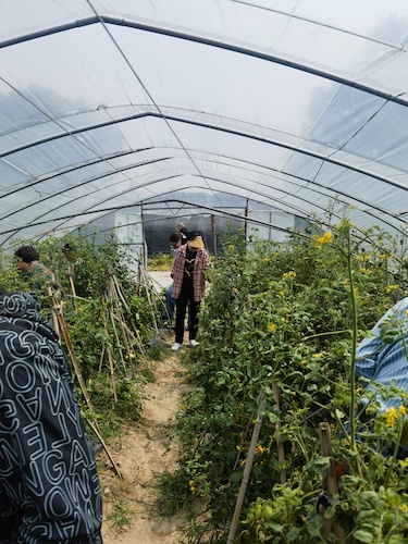 随后,大家品尝了松江特色农家菜,又前往有机蔬果种植基地开展有机蔬菜采摘活动。在小番茄种植大棚里,层层叠叠的绿叶下,一串串长势喜人的小番茄自藤蔓上垂挂下来,空气中浓厚的番茄香味沁人心脾。老师们穿梭其中,采收果实,打包装篮,好不热闹。
