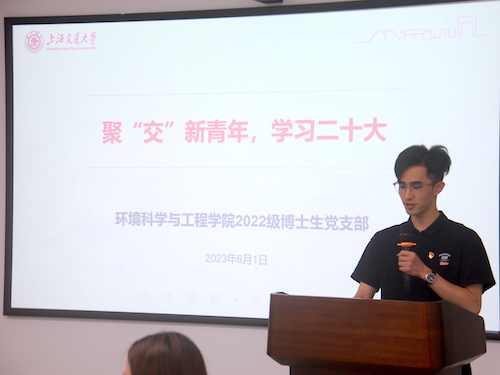 2022级博士生党支部书记何梦达以“聚‘交’新青年,学习二十大”为题,从创建目标、主要做法、活动成效、展望未来四个方面分享了博士新生支部锚定问题导向,攻克传统支部共建难点,创建了四交支部党建和专业学习交流合作的新平台,构建新型“党建+专业”的支部共建模式。