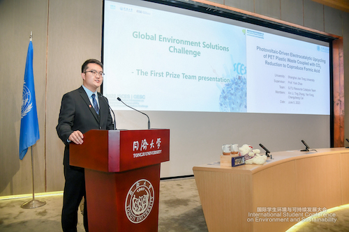 左起:郑庆华(同济大学董事长)、蔡诚诚、李鑫(队长)、张婷、方妍、Mahesh Pradhan(联合国环境规划署东亚海洋协调框架主任)项目标题:Photovoltaic-Driven Electrocatalytic Upcycling of PET Plastic Waste Coupled with CO2 Reduction to Coproduce Formic Acid
