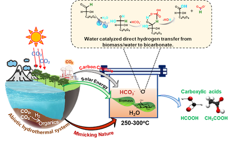 论文基于NaHCO3转化为甲酸盐的碳水化合物还原CO2研究表明,热液环境促进了氢从碳水化合物(葡萄糖,纤维素)直接转移到CO2/NaHCO3,水热水(250℃-300℃,5-20 MPa)作为均相催化剂,在没有任何常规催化剂的情况下,实现纤维素还原CO2/NaHCO3,效率可达76%。