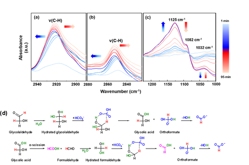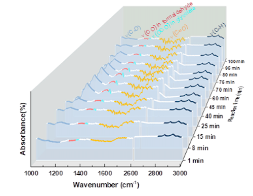 碳水化合物模型化合物乙醇醛在水热水(250℃,自压)条件下的时间分辨原位热液DRIFTS光谱验证了水通过将碳水化合物中的-CHO基团转化为水合态的-CH(OH)2来催化NaHCO3还原,从而实现了醛基氢到NaHCO3的直接氢转移,并且在原子基础上,水与碳水化合物对NaHCO3还原的氢转移比约为13:87。