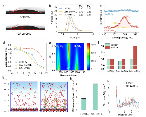 N 1s XPS表明OA-La(OH)3表面的氨基在水溶液中易于质子化为NH3+,同时以磷酸根(H2PO4-HPO42-)作为拉曼探测pH的信号分子,证明了OA-La(OH)3表面的微碱性环境和氨基在水溶液中质子化。Zeta电位结果也表明OA-La(OH)3含有更高的等电点和更多的正电荷。该电正性的OA-La(OH)3有利于定向富集低浓度电负性磷酸根离子,加速磷酸根离子向吸附剂表面迁移和固定,打破低浓度磷酸根传质壁垒。