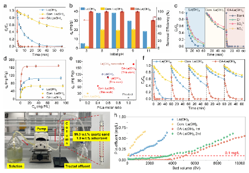 OA-La(OH)3展现出优异的深度除磷性能和循环性。初始磷浓度为1 mg/L条件下,5分钟内OA-La(OH)3实现完全吸附除磷,最大饱和吸附量高达168 mg P/g,远优于未修饰的La(OH)347.9%, 105 mg P/g)和商业La(OH)37.9%, 66.2 mg P/g)。该材料还展现出优异的选择性和循环性,经过5次循环仍能完全吸附除磷。在连续流装置中,OA-La(OH)3可以有效处理~5000床体积的模拟废水和~3700床体积的实际废水至水框架指令标准以下(0.1 mg/L)。