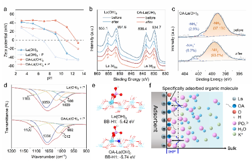 Zeta电位、XPS、红外光谱(ATR-FTIR)和理论计算结果进一步揭示了OA-La(OH)3吸附除磷的机理。具体来说,水体中的磷酸根定向迁移至OA-La(OH)3表面,与其表面-OH发生配体交换,以双齿双核配位构型(BB-H1)稳定吸附在OA-La(OH)3表面。红外光谱图中,归属于双齿双核配位构型的峰发生红移,这说明表面氨基与磷酸根之间形成氢键N−H···O),且该氢键可以降低磷酸根的吸附能(-5.74 eV),这些结果为OA-La(OH)3的吸附除磷机理提供证据