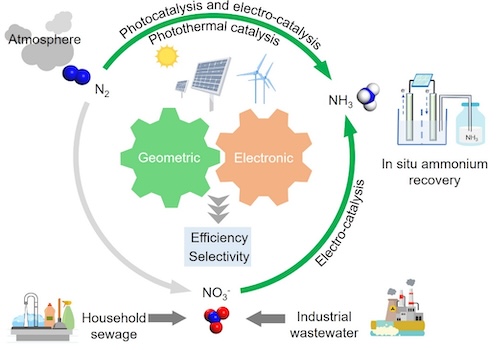 针对以上问题,团队近年来以太阳能或电能为驱动力,催化还原环境中无毒的N2分子或有害的NO3合成NH3(图1),证实了调控催化剂活性位点能够显著提高合成氨反应的活性和产物选择性;通过设计的透过式耦合装置,在无需调节溶液pH下实现了高效氨分离与回收;针对绿色能源驱动的氮循环过程,探讨了其当前在基础研究和工业应用中面临的挑战。