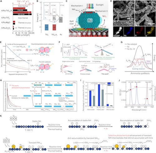 与光催化反应相比,光热催化反应能够利用零带隙的纳米金属而非仅紫外光响应的半导体材料为催化剂,极大提高了全太阳光谱的能量利用效率。此外,光热催化固氮主要通过N2H2的气相反应合成氨,不依赖于水相体系中H2ON2的反应。这些差异赋予了光热催化剂能够通过等离激元(LSPR)效应利用全太阳光谱(300-2500 nm)合成氨,以及借助载流子和辐射热来高效解离N2H2分子。鉴此,团队发展了K/Ru/TiO2-xHx光热催化剂,在低温(360 C)常压下合成氨速率可媲美传统哈伯工艺(Appl. Catal. B-Environ., 2018224, 612-620);发展了具有双温区Fe纳米项链负载氢化TiO2-xHy光热催化剂,发现Fe纳米项链(热区)与氢化TiO2-xHy(冷区)之间的温度差能够加速N2分子在“热区”解离并在“冷区”形成NH3Chem, 2019, 5, 2702-2717);进一步研究表明,Fe纳米项链负载氢化TiO2-xHy光热催化剂打破了N2解离过程中N2分子吸附-反应活化能垒与NHz物种从催化剂表面脱附之间的制约关系J. Am. Chem. Soc., 2020, 142, 17403-17412;构建了具有光化学与光热化学双重特性的Pt1-Ptn-TiN光热合成氨催化剂,发现光化学反应能够选择性促进TiN表面还原加氢至Ti-NH,而Pt1-Ptn可以促进Ti-NH继续加氢至游离氨J. Am. Chem. Soc., 2023, 145, 13134-13146)。