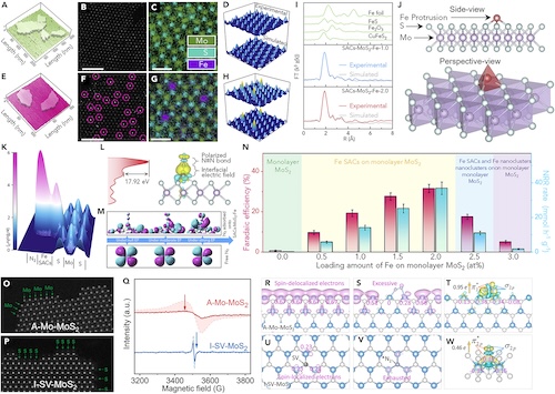 与光化学合成氨过程类似,室温条件下可能再生能源驱动的电化学N2还原合成氨有望替代高能耗的哈伯工艺。然而,水溶液中电化学N2还原合成氨效率受极难活化的NN影响而面临法拉第效率低、竞争性析氢反应严重、NH3产率不高及产物难定量等问题。团队提出了利用界面极化电场诱导NN键解离策略,即在MoS2原子层表面负载凸起状Fe单原子催化剂,发现位于Mo原子上方的Fe单原子通过Fe-S键与周围三个S原子配位,其诱导产生的极化电场强度(17.92 eV)超过了N2离子势(15.84 eV),实现了N2分子NN键直接断裂并显著提升了合成氨速率和法拉第效率(Chem, 2020, 6, 885-901);尽管MoS2电催化剂中引入S空位能够促进自旋极化电子的产生并实现N2NH3的转化,但局域在S空位处自旋极化电子的快速消耗会妨碍NN键活化。团队研究发现MoS2原子层边缘处暴露的大量Mo位点能够促进自旋离域电子产生,进而形成自旋离域电子库,诱导电子快速填充至N2分子的反键轨道并断裂NN键(Appl. Catal. B-Environ., 2023, 323, 122186)。