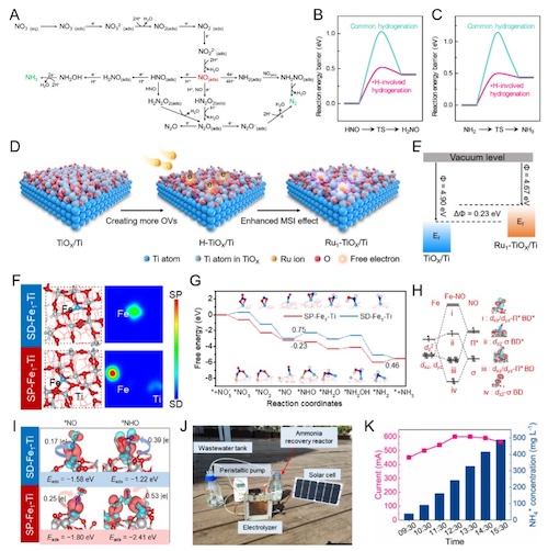 硝酸根是继N2和有机氮以外地球上第三大“氮汇”,其过量排放会破坏全球氮循环、污染地表水、影响水生生态系统并对人类健康造成严重威胁。中国河水中平均硝酸根浓度约15.35 mg/L,具有自西向东、自北向南的不均匀分布特征。尽管废水或地下水中硝酸根的通用处理策略是将其转化为无毒的环境分子N2,但该过程不能实现其升级回收产生高附加值氨或铵盐。从资源和能量回收角度而言,电催化硝酸根还原过程中硝酸根脱氧所需的能量远小于NN键裂解能,有望成为更有前景的绿氨合成工艺。从水溶液中硝酸根还原路径来分析,硝酸根吸附是反应决速步,但中间产物*NO的加氢方式则决定了产物的最终分布。团队提出利用原子氢(H*)降低*NO*NH2加氢过程中过渡态能量的策略来促进硝酸根还原制氨HNO H2NONH2 NH3);然而,用于硝酸根还原的H*来源于水分子裂解,但较大的HO-H键断裂能会影响了电催化剂的H*供应能力(J. Am. Chem. Soc., 2020, 142, 7036-7046);利用表面氟化策略来处理Cu电极,发现表面修饰的F与吸附H2O分子间形成了界面O-HꞏꞏꞏF键,可以显著降低水解离能垒(Environ. Sci. Technol. 2024, 58, 7208-7216);考虑到粉末电催化剂使用过程通常需要利用聚合物粘合剂来锚定在导电载体上,这不仅增加了材料合成过程的复杂性、降低了材料导电性,还容易导致电催化剂与载体间接触不紧密。鉴此,团队利用无支撑的泡沫钛基单原子整体电极来增强反应活性位点与载体之间的化学作用,发现泡沫钛表面的无定型氧化层能够牢固稳定负载的金属单原子(Angew. Chem. Int. Ed., 2022, 61, e20220821);构筑的自旋极化Fe1-Ti双位点能够将吸热的*NO-*NHO加氢过程转化为自发放热过程并降低*NH2-NH3转化过程能垒(Nat. Commun. 2024, 15, 88);考虑到目前的氨分离和回收装置在不同应用场景面临高能耗、投加化学试剂、精准pH调节及外加热等问题,利用可再生能源驱动的透过式耦合装置实现了电化学还原硝酸根到氨及氨原位回收(Water Res.,2023, 242, 120256-120256)。