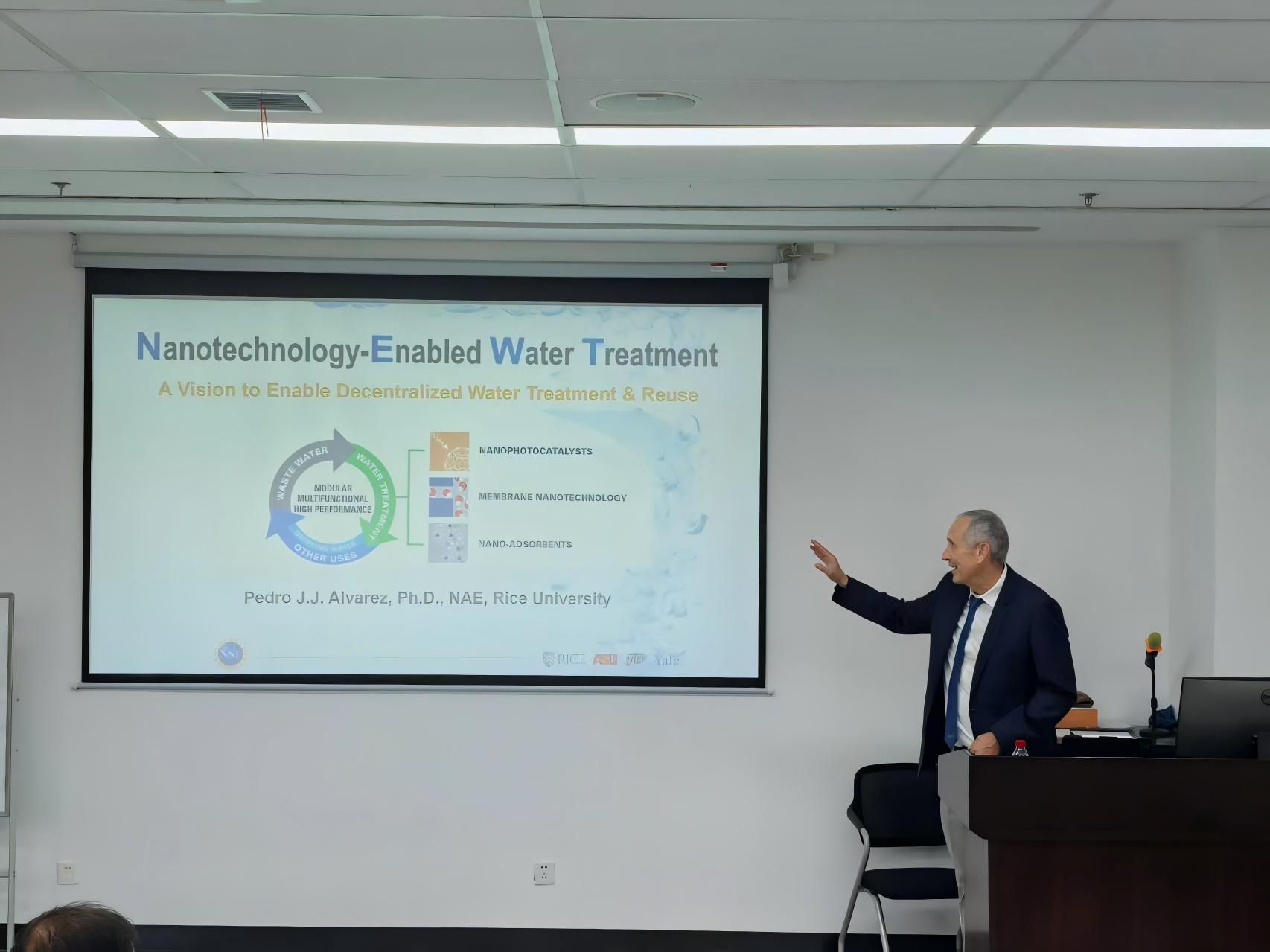 近年来,全球水资源危机日益凸显,约十亿人口面临安全饮水短缺,传统水处理系统在能耗效率、新兴污染物治理及基础设施老化等问题上遭遇严峻挑战。在此背景下,Pedro J.J. Alvarez教授所领导的纳米技术水处理工程研究中心致力于发展基于纳米材料的分散式水处理技术。Alvarez教授详细介绍了其在该方向的最新研究进展,包括发展分散式水处理技术的重大意义,环糊精修饰TiO₂光催化剂通过“捕获—降解”机理高效降解双酚A技术,UV /氯以及六方氮化硼光催化实现PFOA的高效降解与脱氟,磁分离的纳米材料锚定噬菌体、pH响应性涂层包埋噬菌体等实现膜生物污染的防控等内容。