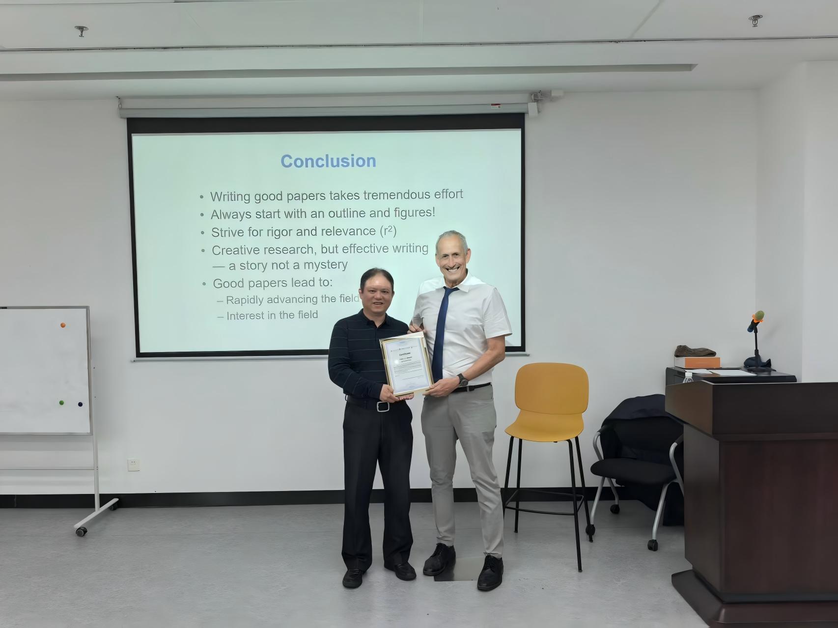讲座最后,龙明策代表公司为Alvarez教授颁发了环境讲坛纪念证书并合影留念。