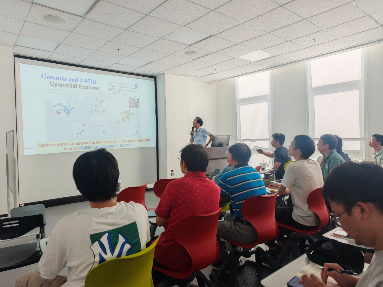 水库和运河是许多国家的主要水源。全球气候变化和水体富营养化背景下,日益频繁的藻类暴发事件对饮水安全构成严峻挑战,亟需深入探究藻类暴发机制并开发相关技术以应对藻类暴发引起的饮用水风险。林教授深入剖析了蓝藻及其代谢物(如2-甲基异莰醇与藻毒素)的生成与去除机制,介绍了基于化学、分子生物学和免疫测定等的分析方法。报告同时分享了国际前沿动态,结合台湾地区和澳大利亚等地的实际监测与治理案例,从科学角度解释了藻类引发的水质安全事件成因。林教授还通过开发浅层储水池及河道中2-甲基异莰醇的质量平衡模型,结合图像识别方法快速评估预测水源水中2-甲基异莰醇的产生风险,将水源监测预警和水厂净水处理工艺相关联,为水源和水厂高效科学应对藻类暴发风险、保障饮用水安全提供了关键理论与技术支持。