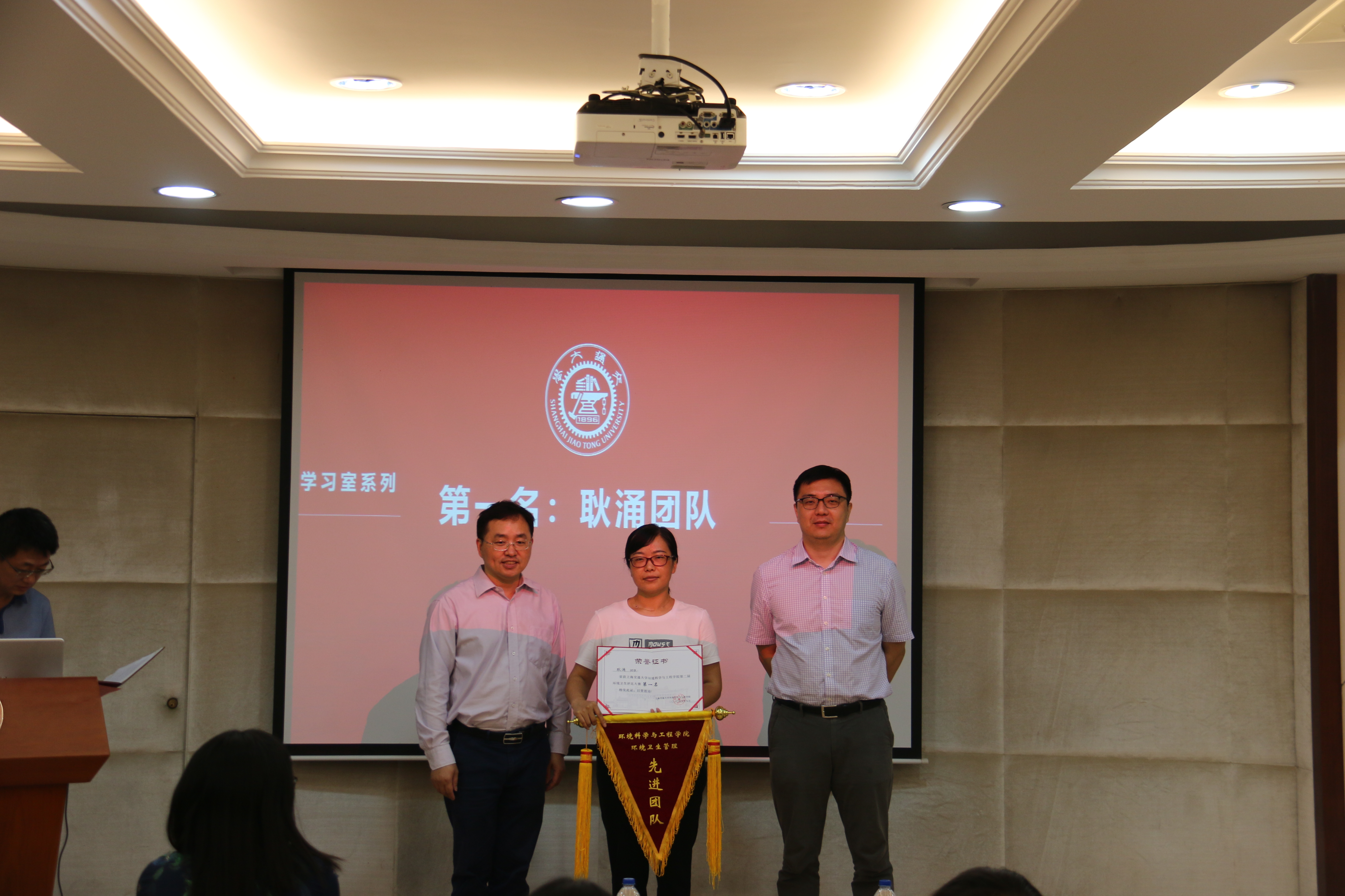 胡薇薇和彭华松为实验室系列获奖团队颁发奖状和流动红旗,陈哲和彭华松为学习室系列获奖团队颁发奖状和流动红旗,并与获奖团队合影留念。(红旗每三个月流动一次)