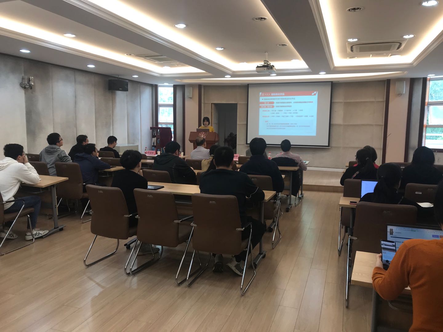 刘闯进行了化学品存放管理的专题培训。他主要从常见危化品存放规范与隐患、实验气体及钢瓶存放规范与隐患、各类试剂柜安全使用等方面作为重点,列举公司安全检查中经常出现的一些安全隐患并进行图片展示,增强师生的安全意识。