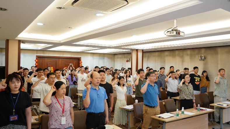 党课结束后党委书记胡薇薇带领15名新党员和全体党员代表集体宣誓,一起重温入党誓词。新党员们表示,一定牢记入党誓词,自觉以习近平新时代中国特色社会主义思想武装头脑,遵守党的章程,履行党员义务,严守党的纪律,坚定共产主义理想,不断加强党性修养,不断提高政治站位,刻苦求学、努力工作、力争优异的成绩,做一名优秀的共产党员。