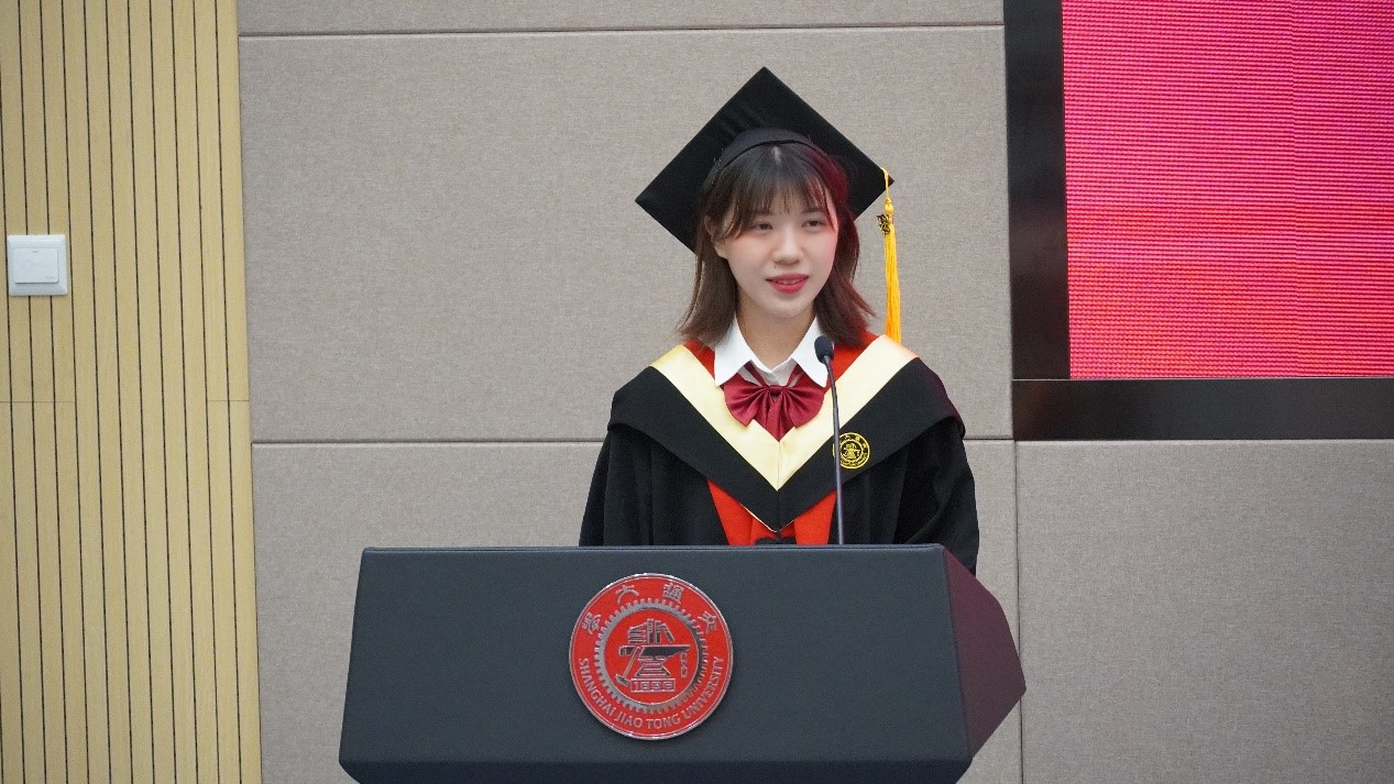 F17级邹幸玥作为员工代表发言,她说到:在交大​BETVICTOR伟德的四年里,一次又一次的尝试、思索、磨砺和进步,让脚踏实地、爱国奉献的交大精神融入每一个交大毕业生的血液里,不断激励着我们做出无愧于青春,无愧于时代,无愧于人民的选择与贡献。也许征途漫漫,也许风雨兼程,愿你我以自强不息为楫,乘风破浪,扬帆远航,无愧于“饮水思源,爱国荣校”的校训,将青春融入祖国的山河!