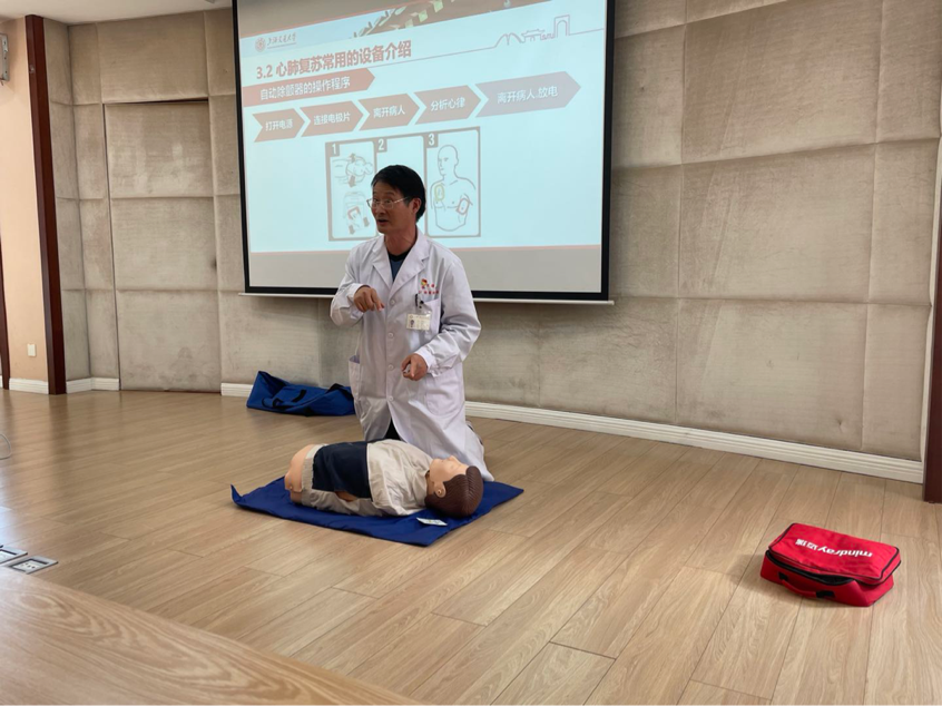 上海交大校医院经理刘金生副主任医师做应急救护安全培训。他从近期新冠肺炎的抗议防控工作救护讲起,重点介绍了心肺复苏并为大家进行了心肺复苏的现场演示和除颤器的使用演示。刘金生和同学们分享必备的急救与自救知识,提醒大家在努力学习工作的同时重视自我健康管理。