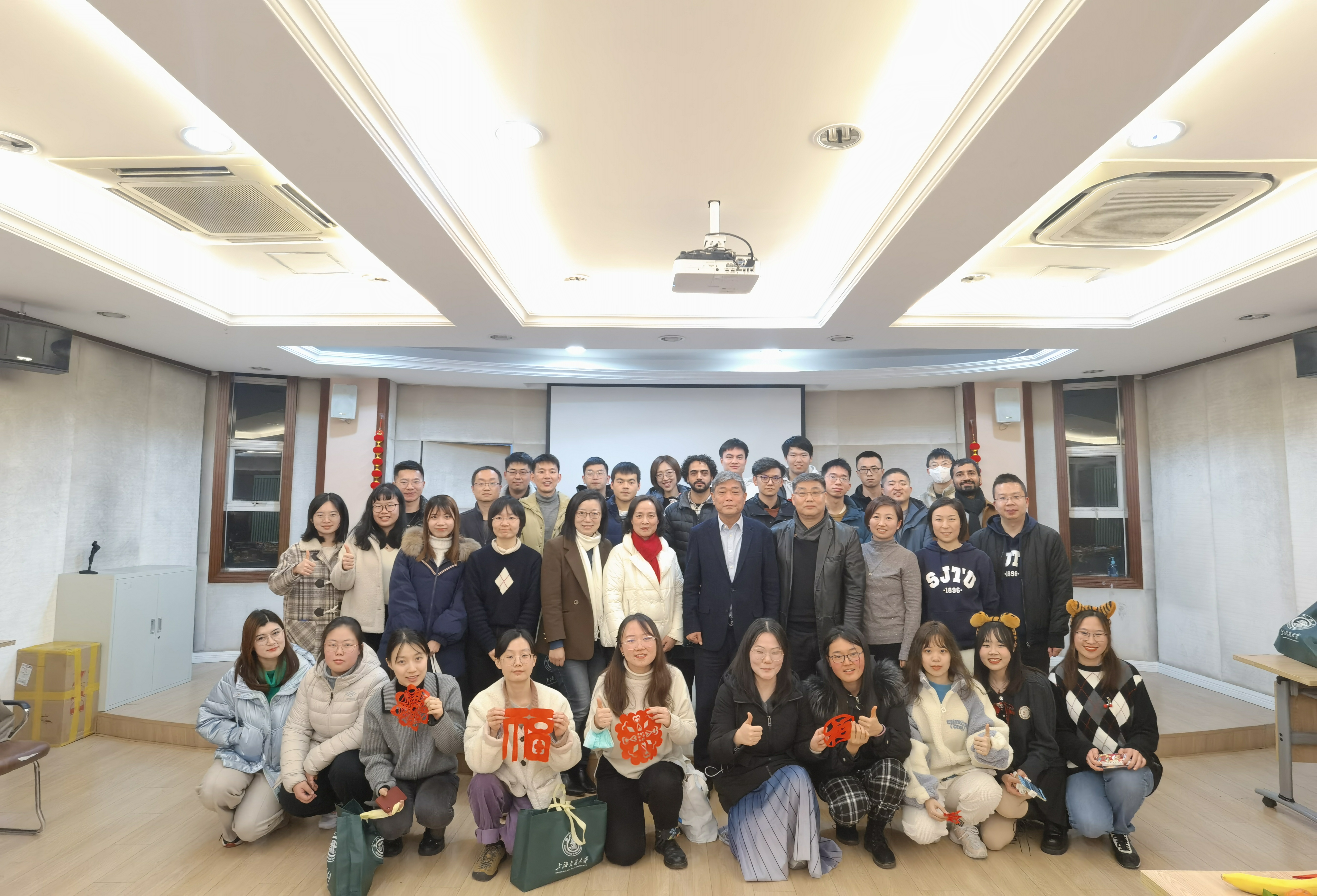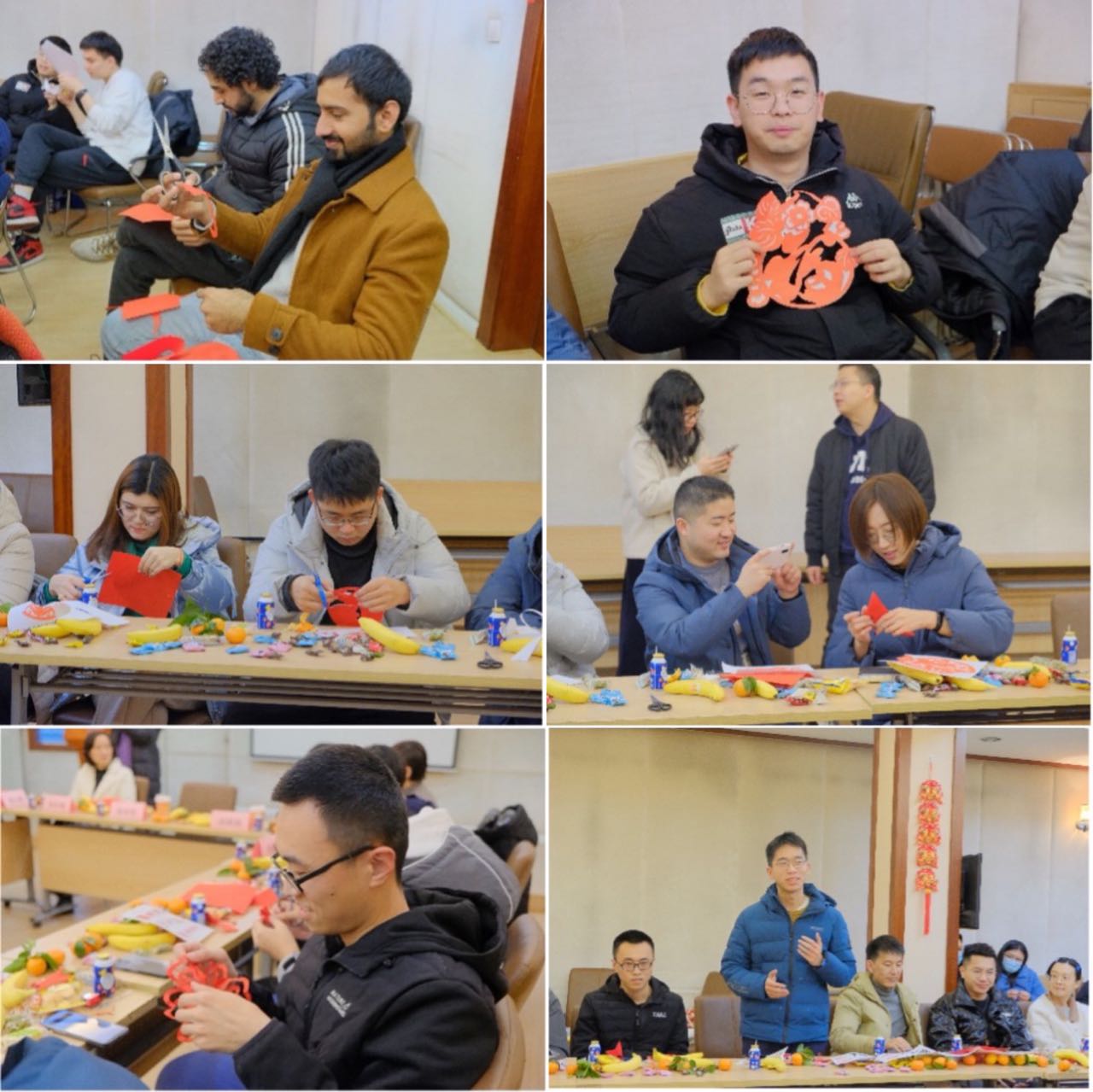 留校同学逐个介绍了自己的寒假留校生活与学习科研情况,随后师生们一起剪窗花喜迎新春。剪窗花一直是中华民族欢度春节的重要习俗,大家一笔一画绘好样本,一刀一剪裁出窗花。随着“咔嚓咔嚓”的剪纸声,一幅幅精美的“作品”被呈现出来。在剪纸过程中大家充分发挥想象力和创造力,遇到难题相互交流、互帮互助,既品味了传统文化习俗、获得了精神滋养,又体验了艺术创造所带来的乐趣和成就感。漂亮的窗花充满着浓浓的年味,也传递着对远方家人的思念;火红的福字装扮了公司楼宇,也温暖了大家的心!
