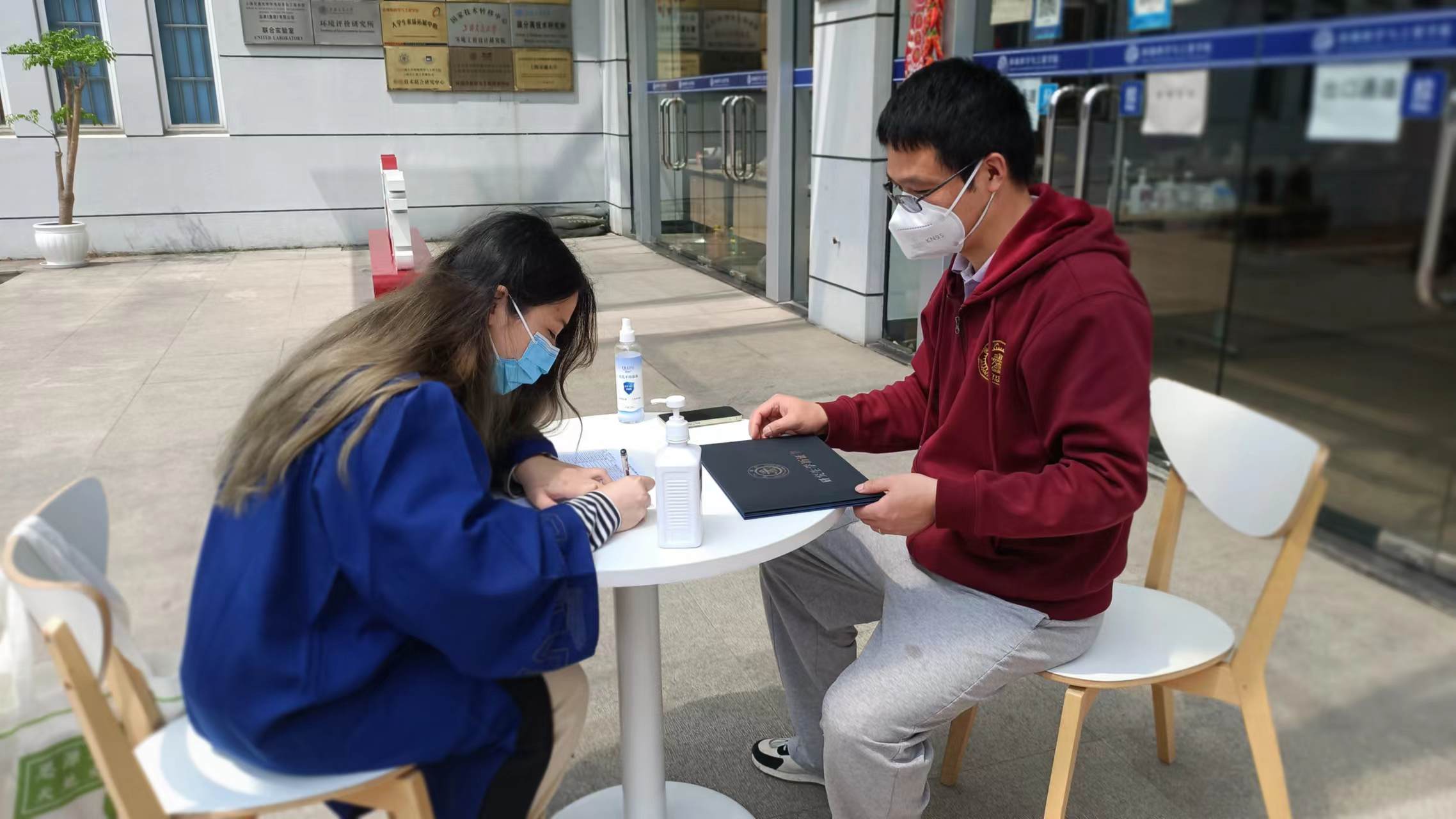 因受疫情影响,​BETVICTOR伟德毕业典礼无法如期举行。为弥补这一遗憾,坚守抗疫一线的老师们通过精心安排,特意为2022届首位领取双证的硕士毕业生在环境楼外举行了一场暖心的欢送仪式。