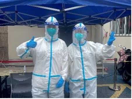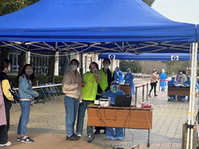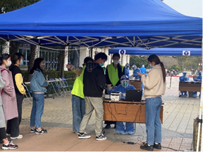 在核酸检测志愿服务中,支部党员樊林平、张博、罗颖、冯康宏、黄安华,查丽娜等同志在疫情初期人手严重不足时,主动参与到新图核酸检测志愿者服务,及时摸排密接人员,为控制疫情的发展作出巨大贡献。程勋强、陈佳斌、彭耀威、黄安华、谢智雄同志响应公司号召,甘冒感染风险,在防疫物资不足的情况下,做“最美的逆行者”,参与到密接和发热人员的核酸检测志愿者服务中。樊林平、金一卉同志在校内疫情稳定后,仍然奉献在第一线,化身“大白”,参与校内日常核酸检测志愿者服务。他们表示,核酸检测志愿者虽具有一定的危险性,但“甘愿奉献,不怕危险”是作为党员的使命和责任,希望能以实际行动践行“党员先上”的无畏精神,站好毕业季的“最后一班岗”!