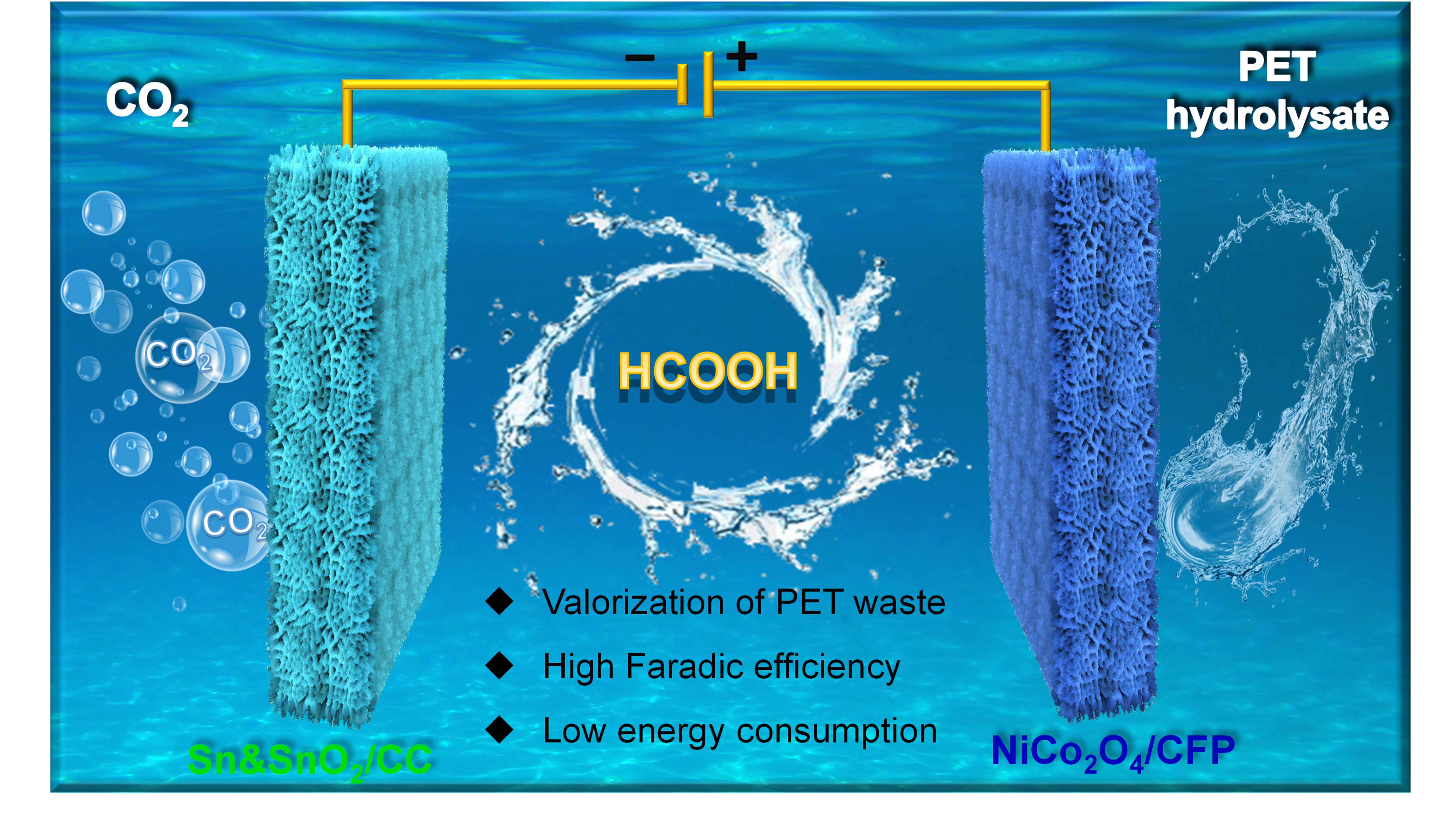 电催化重整PET废塑料和CO2联产甲酸产物示意图