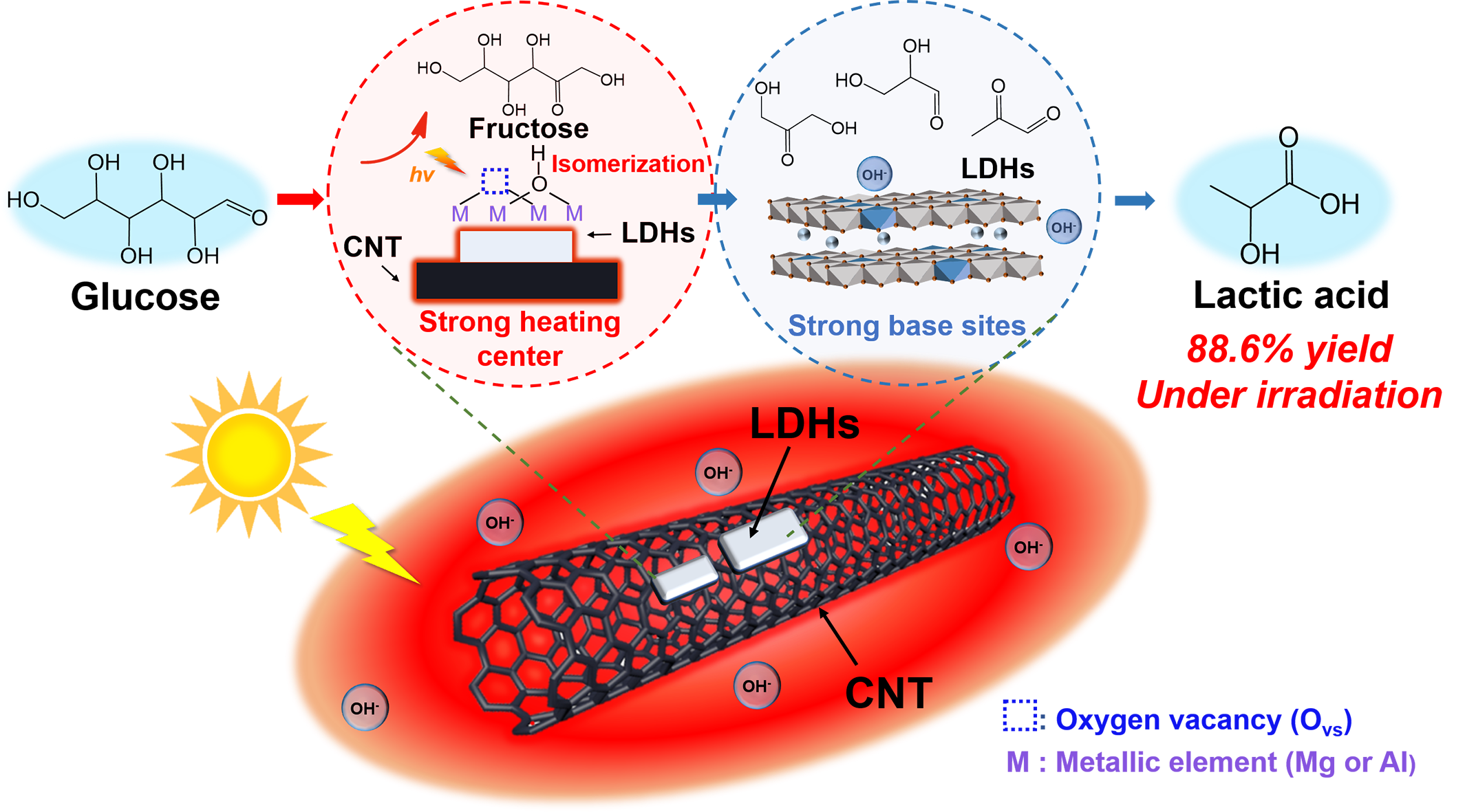 基于CNT/LDHs光热催化剂的太阳能驱动高效催化转化生物质产生物可降解塑料原料乳酸新技术