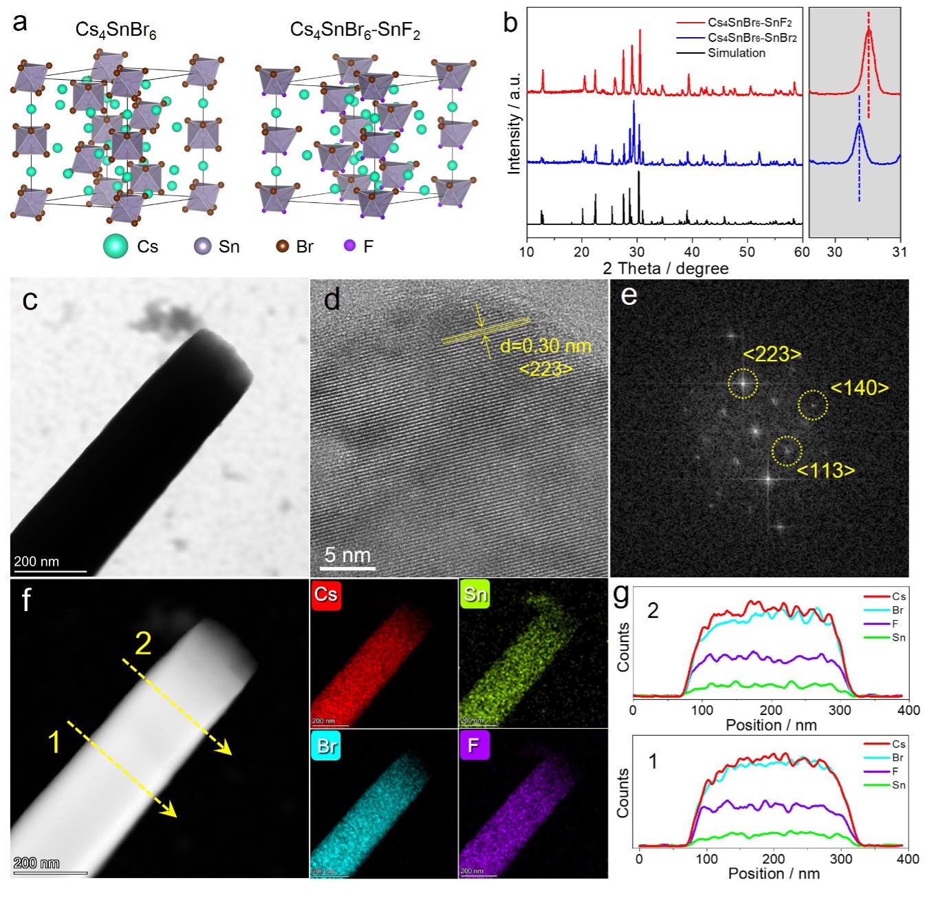 图1. SnF2衍生的Cs4SnBr6钙钛矿的结构与形貌特征