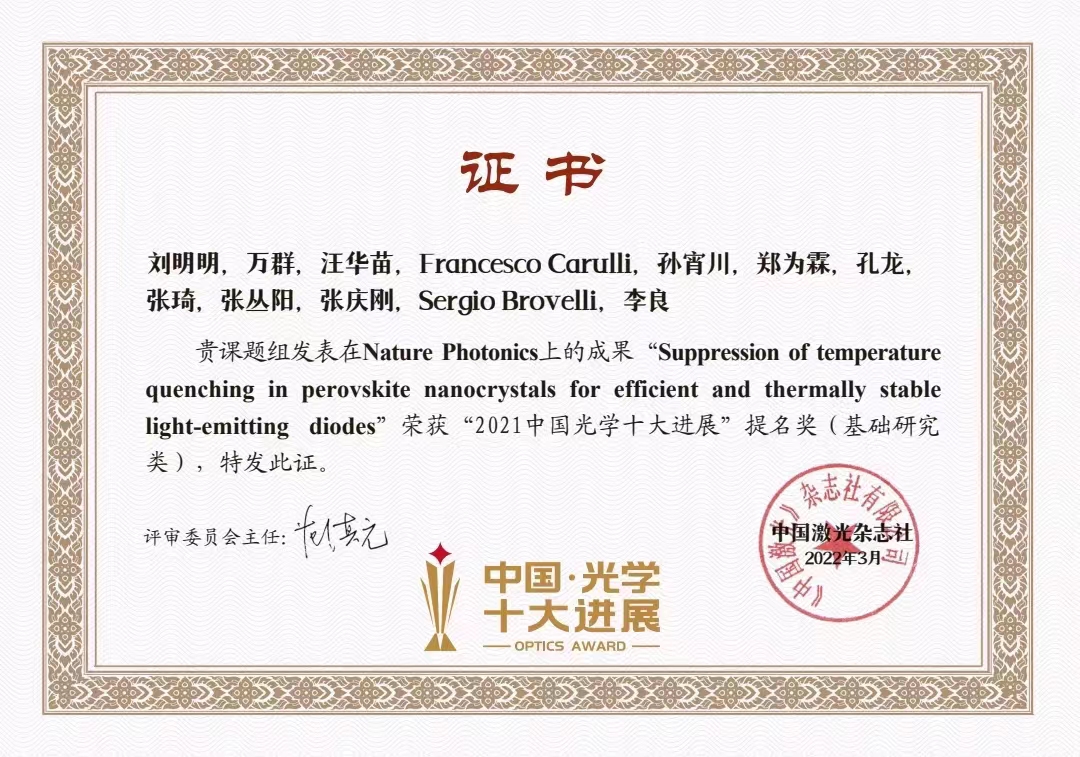 近日,中国激光杂志社发布“2021中国光学十大进展”。经过评审委员会多轮遴选,10项研究入选基础研究类,10项研究入选应用研究类,19项成果获得提名奖。其中,BETVICTOR伟德李良教授课题组与合作团队在2021年于Nature Photonics期刊发表的“Suppression of temperature quenching in perovskite nanocrystals for efficient and thermally stable light-emitting diodes”研究论文荣获“2021中国光学十大进展”提名奖(基础研究类)。BETVICTOR伟德刘明明博士、万群博士,机械与动力工程公司汪华苗副教授为论文共同第一作者,意大利米兰-比科卡大学Brovelli Sergio教授与李良教授为共同通讯作者。该工作中,通过氟化物后处理钙钛矿量子点的方式,首次实现环境温度处于100℃范围内量子点荧光性能近乎零“热猝灭”,所制备的LED电致发光器件也具有优异的抗“热猝灭”性能。